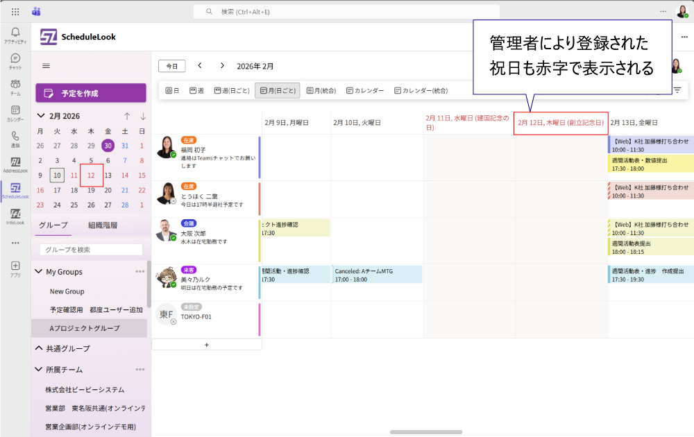 管理者が設定した祝日はScheduleLook上の全ユーザーのカレンダーに反映され、日本の祝日同様に赤色で表示します。