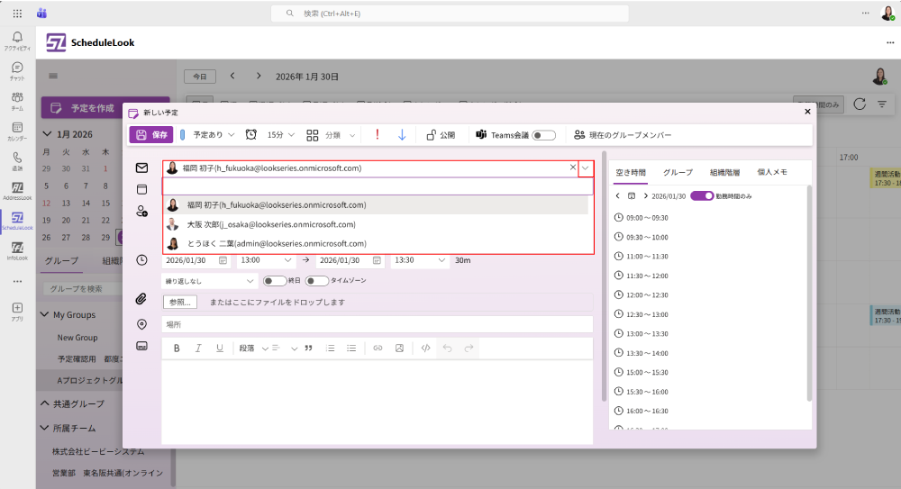 ScheduleLook for Microsoft Teams は、組織内メンバーの予定を Teams 上で共有できるグループスケジューラーです。