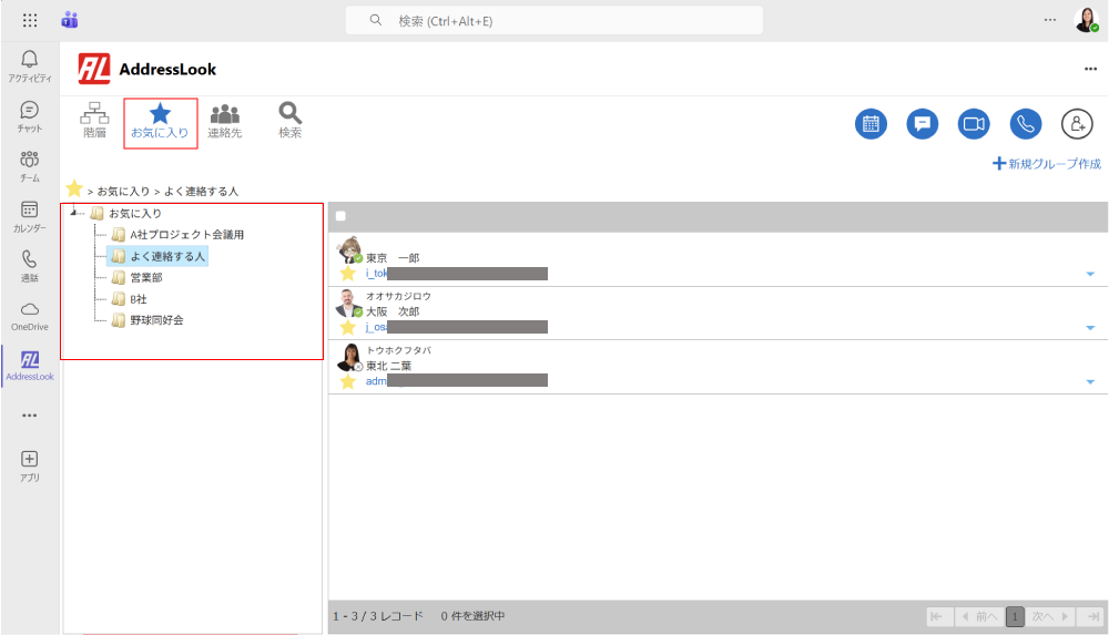 よく連絡を取る人、一時的なプロジェクトチームなど、Teamsでグループを作るほどでもない場合、個人で追加・削除ができるお気に入りグループを作成できます。お気に入りフォルダーからメンバーを選択し、チャットや会議作成ができます。
