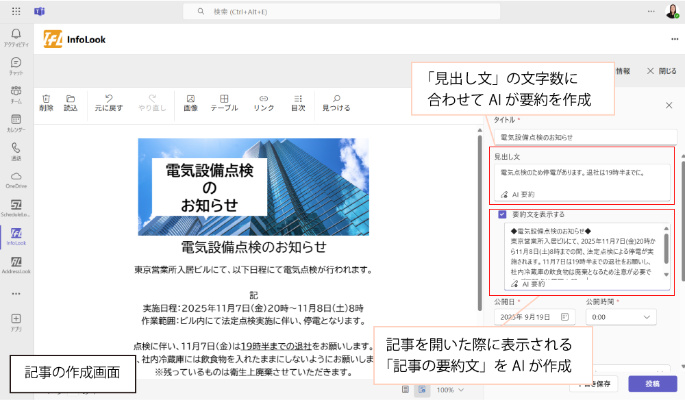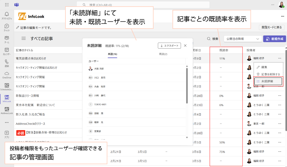 InfoLookは、社内InformationをMicrosoft Teams上で発信・未読既読管理ができる掲示板アプリです。