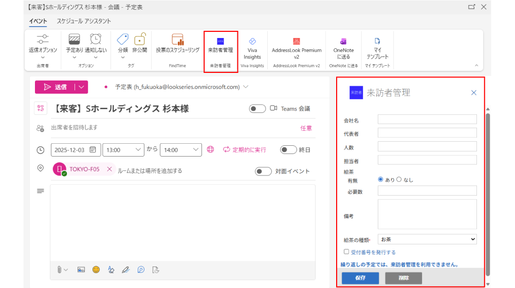 Outlookでの予定作成時に、「来訪者管理アドイン」から来客情報の入力を行うことができます。来社される企業名や人数・給茶の有無などを入力しておくことで、受付担当者に共有することができます。
