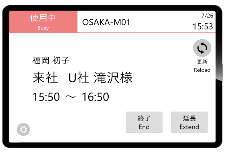 各会議室に設置し、次の予約や終了前アラートなどで、利用を効率化します。