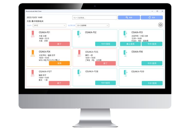 1台で会議室を集中的に管理ができ、空き状況の把握や、会議室への入室と退室の操作が可能です。