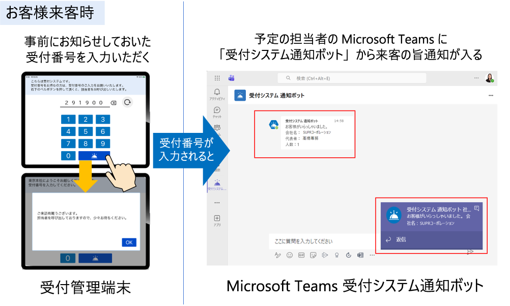 - 担当者宛にTeamsチャットで、お客様来社をお知らせ