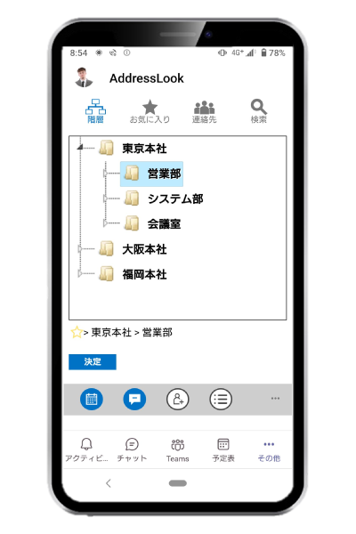 ✓ 組織ツリー、お気に入り、個人連絡先・検索といったPC版と変わらない表示形式を利用可能