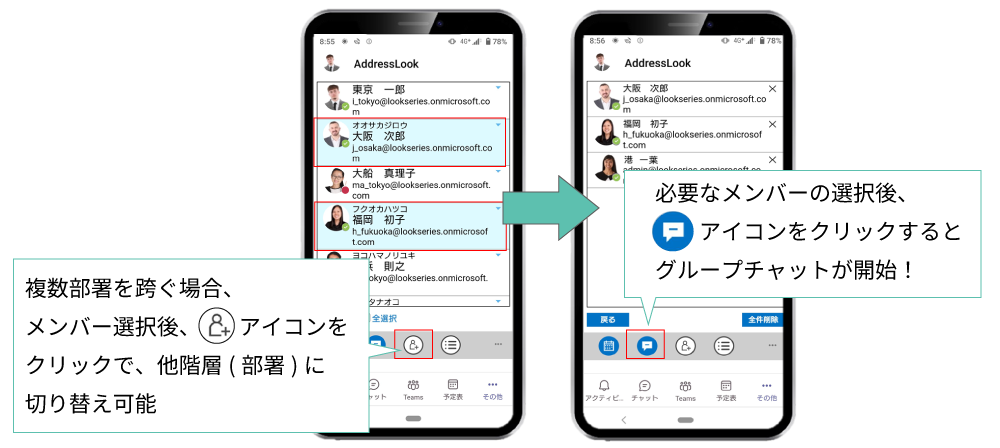 階層表示のアドレス帳からメンバーを選び、チャットアイコンを押すだけで利用できます。モバイル端末の画面でも、操作に迷わない直感的な宛先選択を実現します。