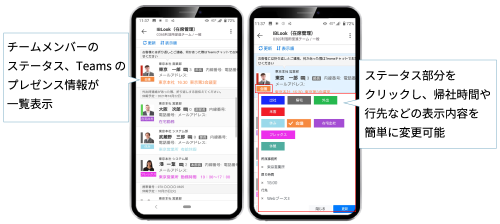 現在地から次の打合せ場所までの間、スマホからステータスと戻り時間を変更可能。在席状況の共有も、隙間時間を使えます。