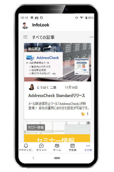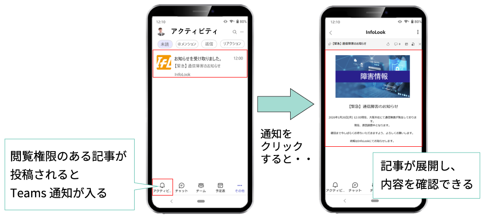 届いたお知らせは、 Teams のアクティビティに表示され、その画面から記事内容をすぐにチェックできます。Teamsアプリ上で開くため、Teamsアカウント以外からの利用も制限されて安全に利用できます。