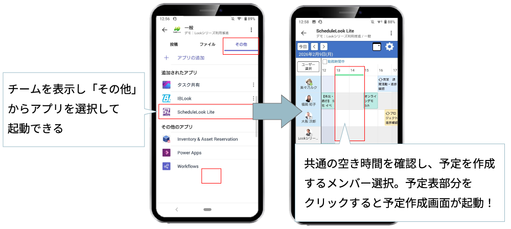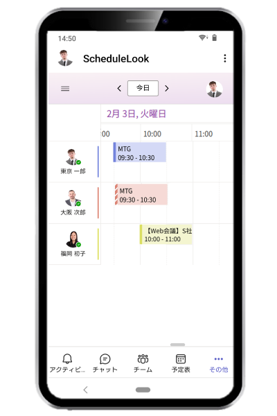 お客様先への訪問後、チームメンバーとの打ち合わせが必要になった場合でも、スマホからその場で予定調整が可能です。チームメンバーの中から、予定を確認したい人だけを表示することもできます。 スピード感をもって、次のアクションにつなげられます。