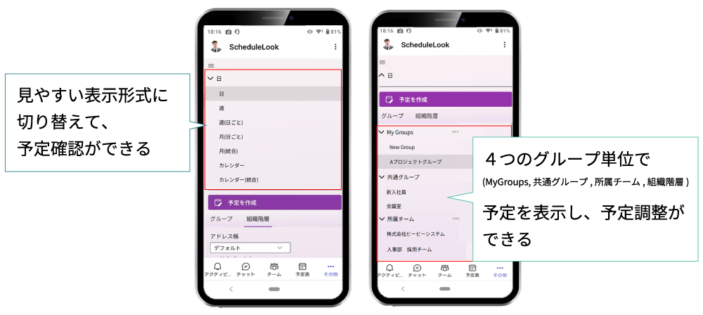 ✓ PC版と変わらない豊富な日付表示形式(1日・週間・月間・カレンダー)、グループ単位での予定確認が可能
