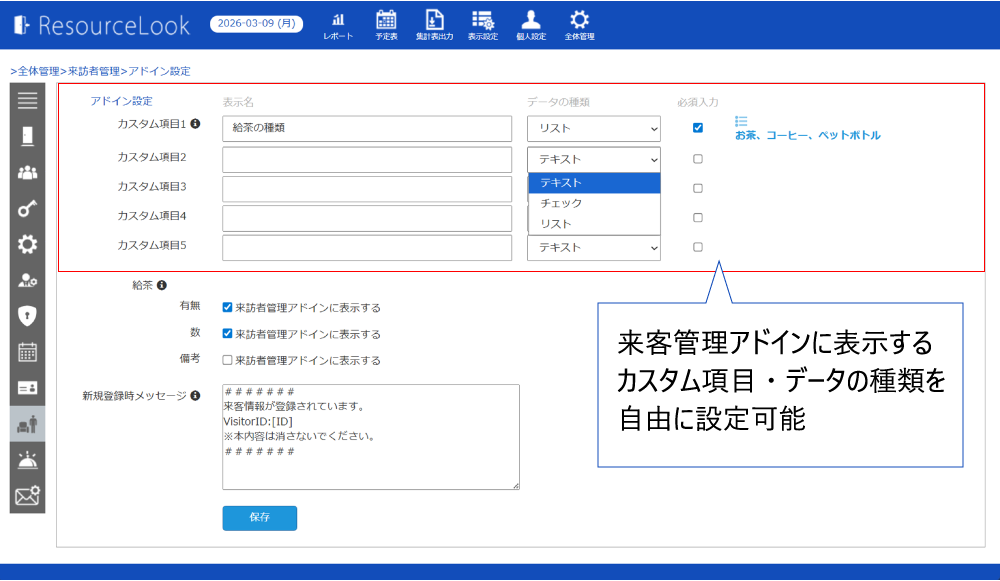 「来訪者管理アドイン」には、利用企業ごとに自由に設定できる「カスタム項目」があります。企業名や人数などの基本項目に加え、自社の運用合わせた項目を、自由に追加することが可能です。