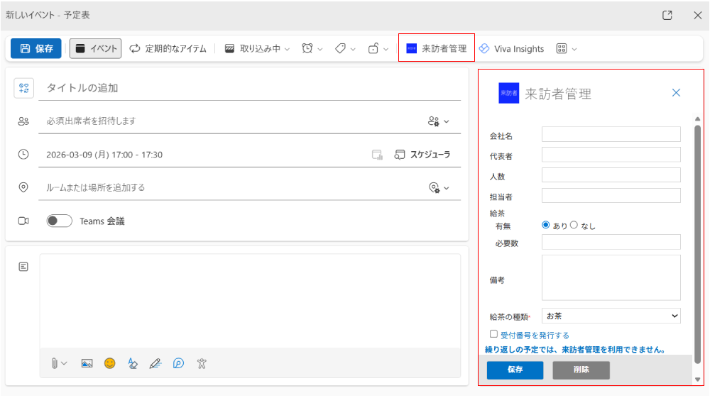 ResourceLookの「来訪者管理アドイン」を使って、Outlookから会議予約と同時に、来訪者情報を登録できます。