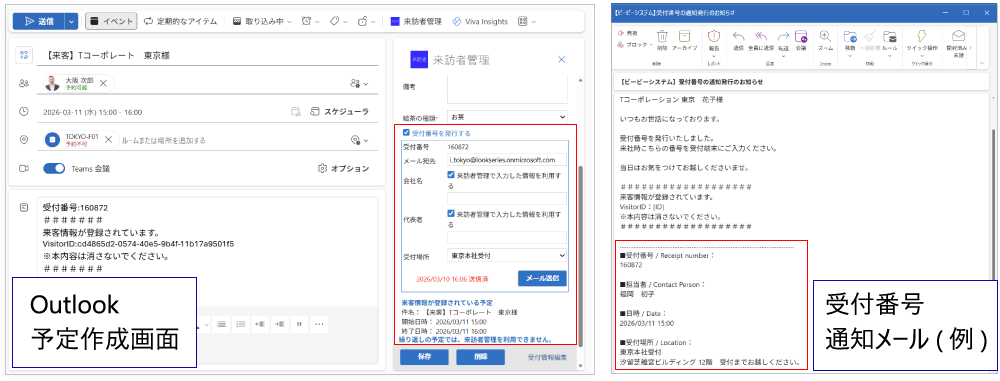 「来訪者管理アドイン」で来客情報を入力後、「受付番号」を発行。 同じ画面から、お客様宛にメールで受付番号を送付することも可能です。