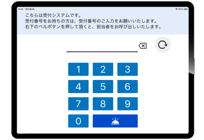 来社時には、お客様自身で受付端末に受付番号を入力していただきます。端末には「少々お待ちください」と表示されます。
