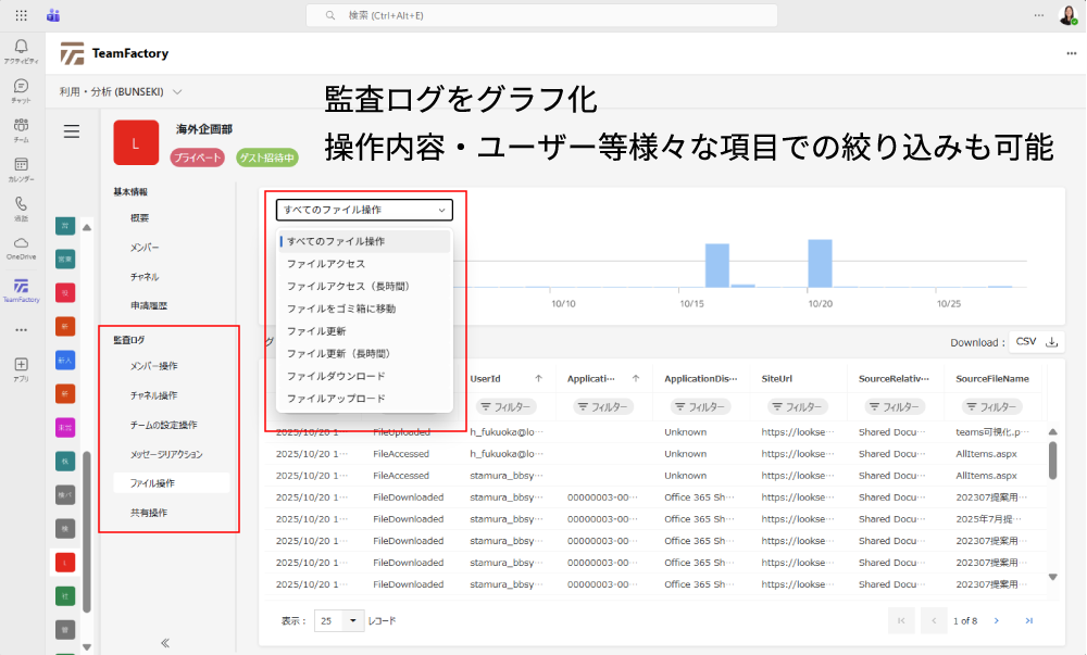 Teamsチーム内のメンバー操作、チャネル操作、チーム設定(変更)操作などの監査ログを確認することができます。フィルター機能もあり、確認したいメンバーを選択しての確認、行った操作からの絞り込みなども可能です。また、結果をCSV出力できるため、より詳細に分析するなど活用もできます。