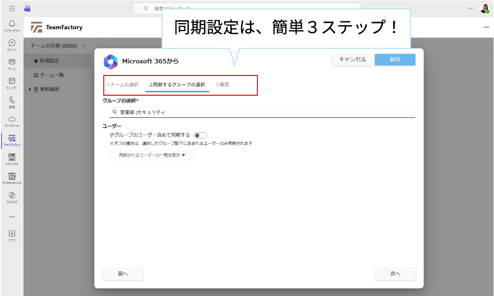 TeamFactory画面で、Teamsチームと同期したい既存のグループを設定しておきます。一度設定をしておけば、既存グループまたは階層情報に変更があった場合、Teamsチームにも自動で反映されます。反映結果は、TeamFactoryの管理者向け画面確認と、チーム責任者へのTeamsアクティビティ通知でお知らせします。