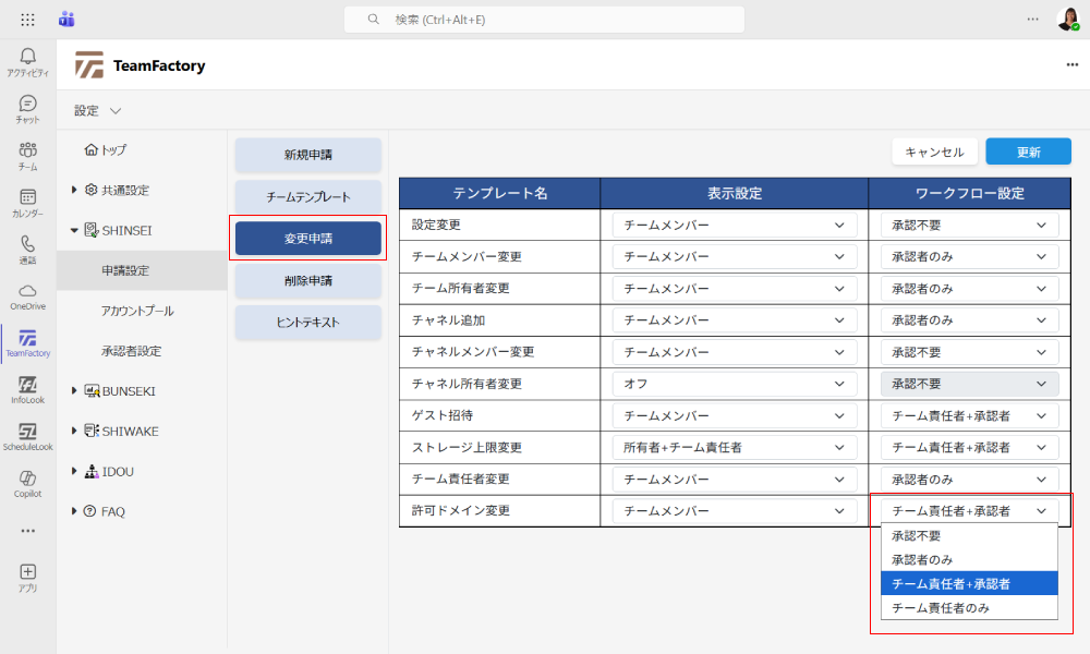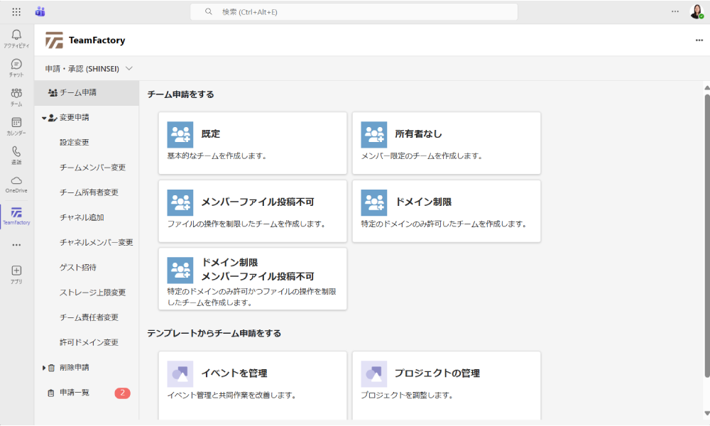 新しいチームの作成、既存チームの設定変更をTeams上で、申請が可能です。