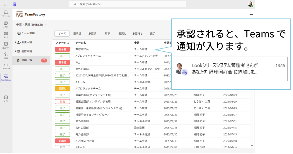 申請先の承認が得られると、申請内容に沿ったチームが自動的に作成され、所属メンバーのTeamsに反映されます。また、メンバー追加やチャネルの追加、ゲスト招待といった変更申請も可能です。利用者は自分が申請した内容も、SHINSEIから状況確認ができます。
