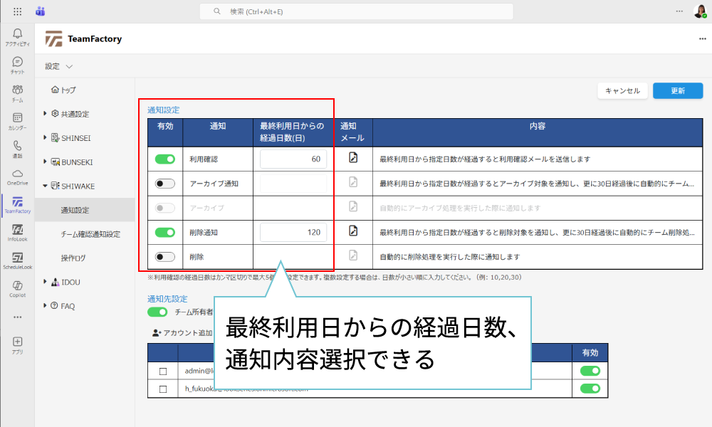 通知設定にて、一定期間利用のないチームの所有者にチーム処理を促すことができます。通知後30日間でチーム利用、チーム操作が行われなかった場合、自動でアーカイブ・削除操作が行われるよう設定も可能です。チームの自動処理ができます。