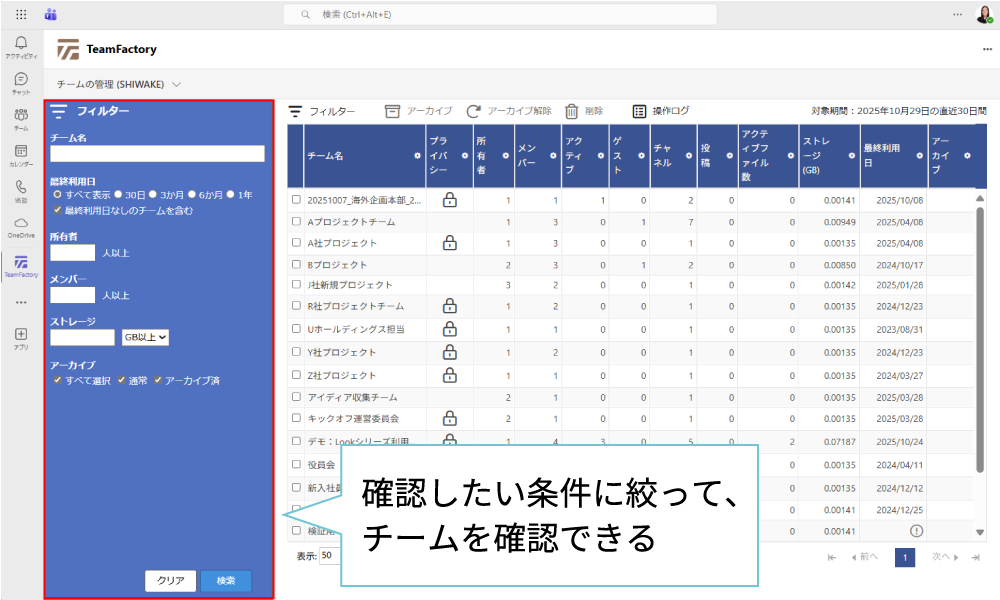 SHIWAKE for Microsoft Teamsは、Teamsのチームに関するアクティブ状況を確認し、増え続けるチームの仕分けを自動化できます。