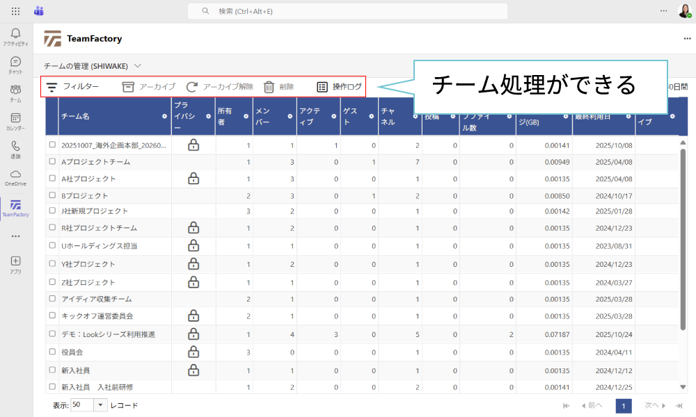 SHIWAKEで、テナント上のチームの利用状況を一覧で確認ができます。利用のないチームのチーム処理も可能です。チームの自動処理の設定もでき、Teamsの利用状況を快適に保つことができる機能です。